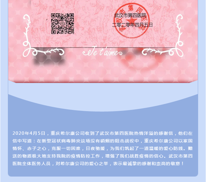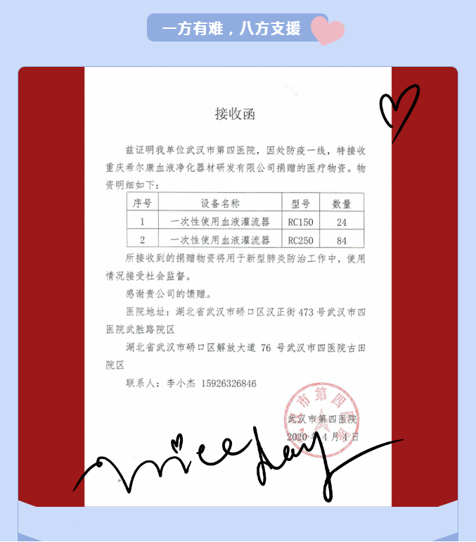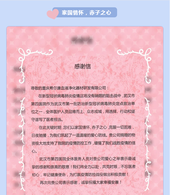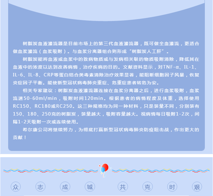 血液净化器材技术领域实现了与世界的同步和接轨 Blood purification equipment technical field To achievesynchronization and integration with the world 企业资讯学术专题健康宣教视频与文档 > 媒体中心 > 企业资讯 战“新冠”,树脂炭来加油! 发布时间:2020-04-08 发布:希尔康 联系我们: 服务热线:4008-110-978 联系电话:023-67505445/6 E-Mail:xek@cqxek.com 网址:www.cqxek.com 上一篇 希尔康公司又获得一项国家发明专利 返回列表 下一篇 “战新冠,用你的镜头夺冠”评选结果
