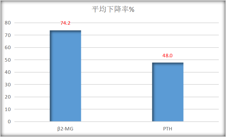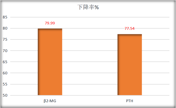 10例尿毒症患者进行血液灌流(希尔康SR130)联合血液透析治疗前与治疗后发现,血液灌流能显著的降低尿毒症患者血液中高β2-MG及PTH毒素(详见表1、2),其中图表3为优秀个例,β2-MG治疗前42.13mg/L,治疗后8.43mg/L,PTH治疗前676.65pg/L,治疗后151.96pg/L,下降率分别为79.99%和77.54%,患者主观感觉良好,而且明显改善临床症状。