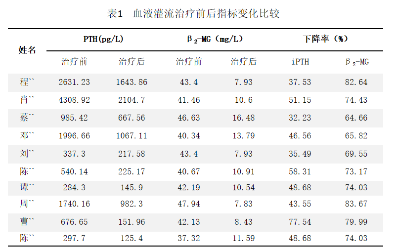 血液灌流治疗前后采集血液标本,对血液中β2-MG及PTH进行指标检测。