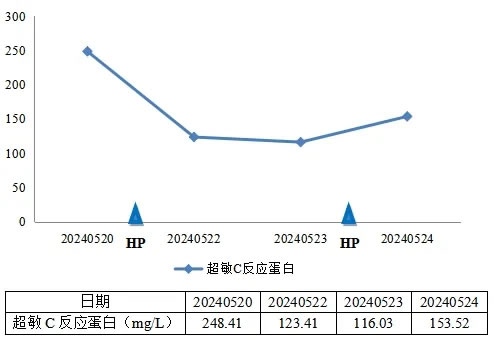 患者超敏C反应蛋白浓度在CRRT+HP+ECMO治疗过程中显著下降。